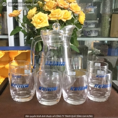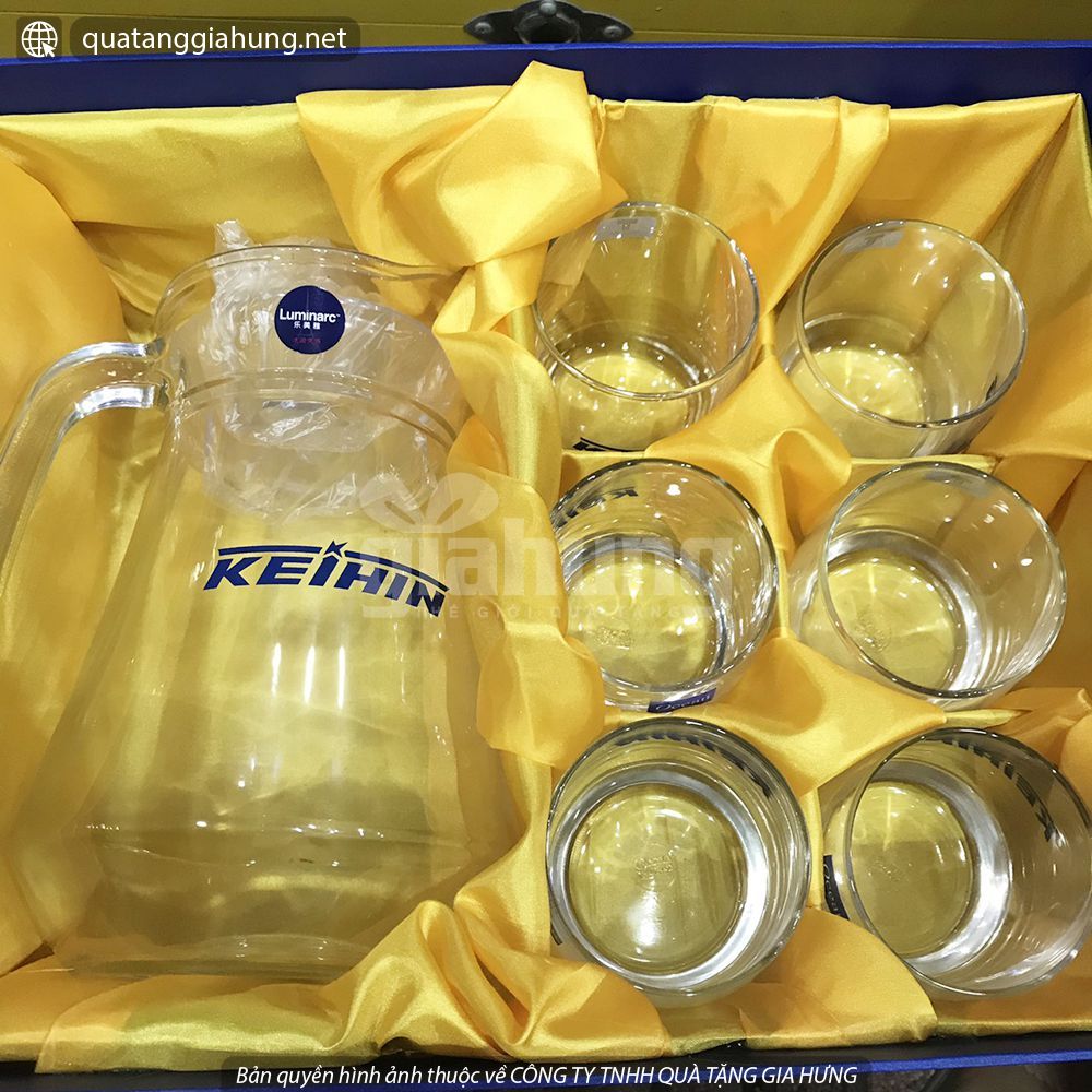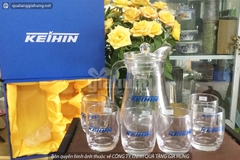 BỘ BÌNH CỐC THỦY TIN CỦA KHÁCH HÀNG KEIHIN - Bình và cốc bằng thủy tinh cao cấp chính hãng LUMIARC. In logo lên thân cốc và bình - Hộp đựng bọc vỏ xi, bên trong lót vải lụa vàng. In logo lên mặt hộp - Số lượng đặt hàng tối thiểu: 20...