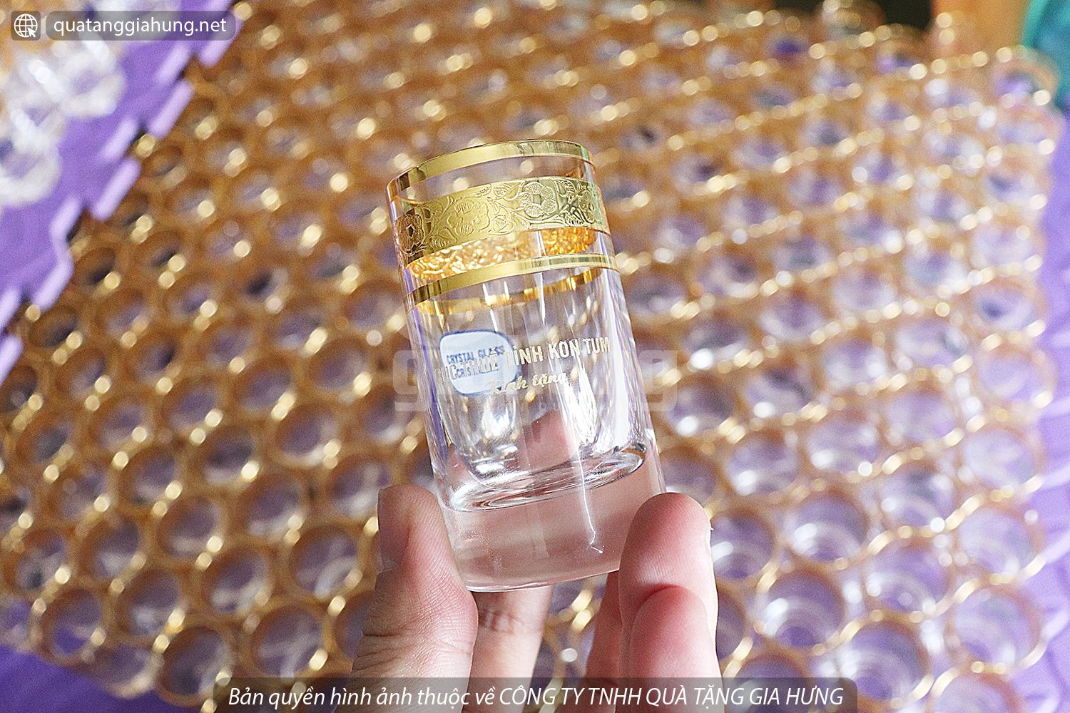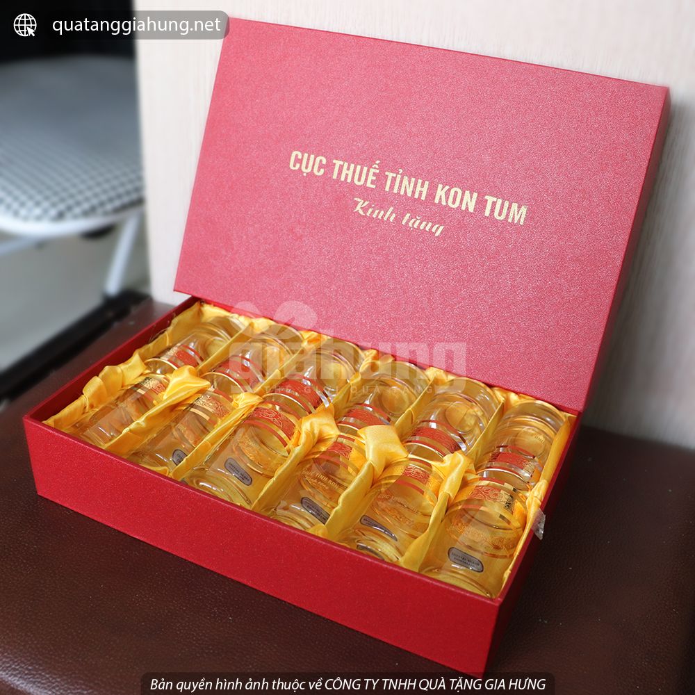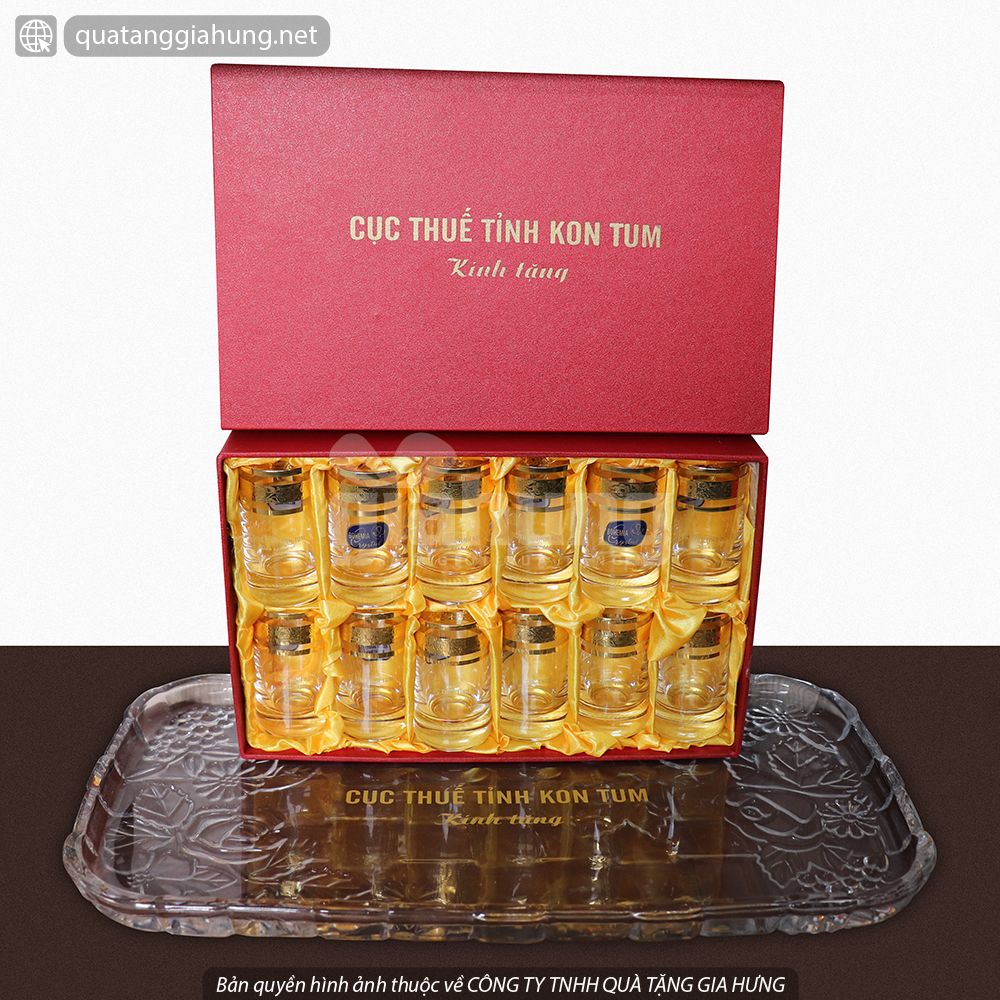Bộ chén thủy tinh Tiệp của CỤC THUẾ TỈNH KONTUM - Chén làm bằng thủy tinh cao cấp. Trong suốt như pha lê - Chuyên dùng để uống rượu. Kích thước: 3,6 x 6,5 cm - Tùy chọn in logo, nội dung màu nhũ vàng lên thân cốc - Đựng trong hộp xi lót...